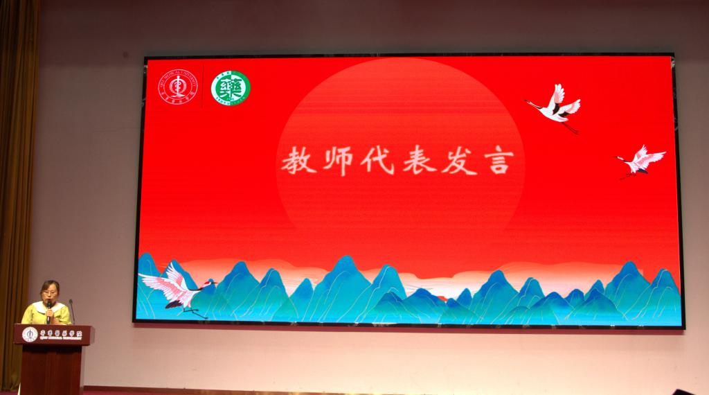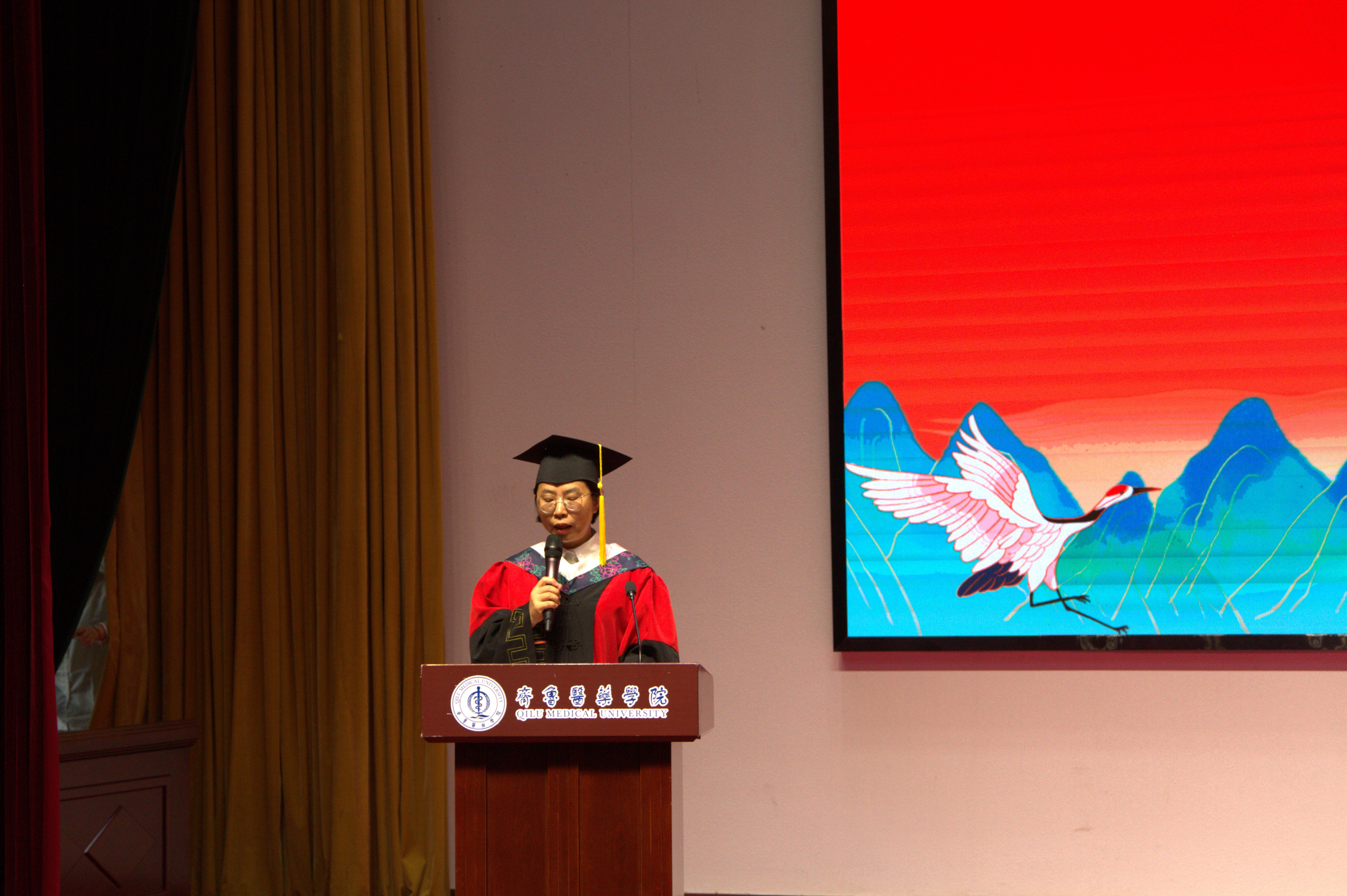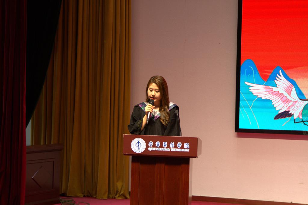 教师代表郗红娟老师与同学们分享了自己的人生经历,希望同学们学会做人,德才兼备,学会做事,精益求精。愿同学们满怀以天下为己任的豪情投身到燃烧的青春中去。祝毕业快乐,医路顺风!