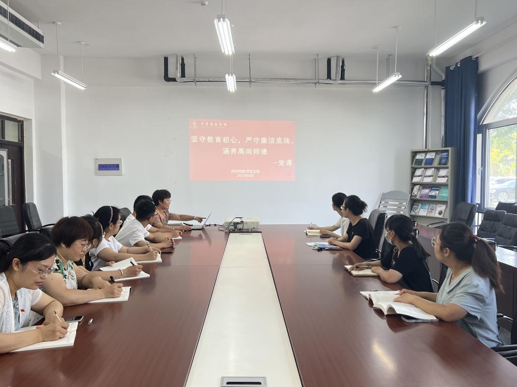 教师党支部书记王立娟讲了题为“坚守教育初心,严守廉洁底线,涵养高尚师德”廉政党课。她要求,党员教师一定要持之以恒严格遵守《新时代高校教师职业行为十项准则》,做到坚守教育初心,严守廉洁底线,涵养高尚师德,为成为党和人民满意的有理想信念、有道德情操、有扎实学识、有仁爱之心的“四有”好老师。